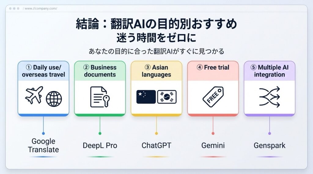 結論:翻訳AIの目的別おすすめ