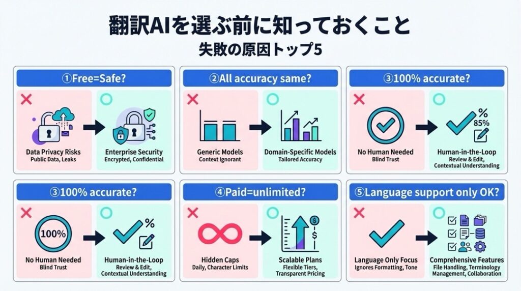 翻訳AIを使い始める前に、初心者がよく陥る誤解や落とし穴を知っておきましょう。これを知らないと、後で「こんなはずじゃなかった」となりかねません。