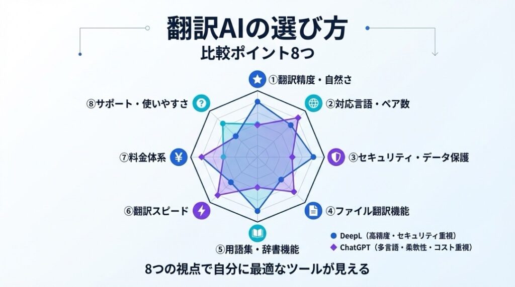 翻訳AIを選ぶ際に、どこを見れば失敗しないのか。ここでは、プロも重視する8つの比較軸を解説します。この視点があれば、自分に最適なツールが見えてきます。