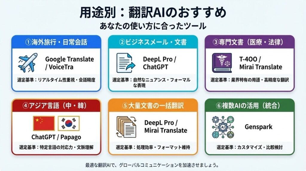 ここまで、16の翻訳AIを徹底比較してきました。最後に、目的別のベストチョイスを再確認しましょう。