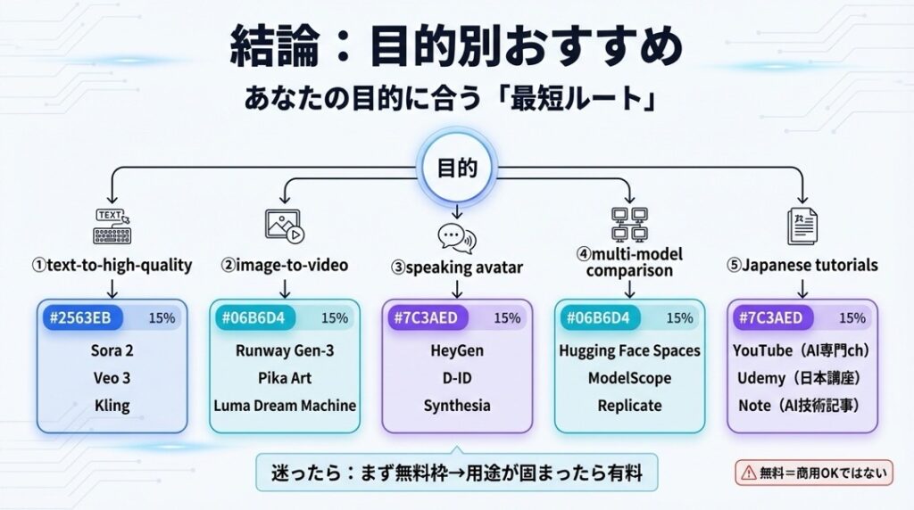 結論:動画生成AIの目的別おすすめ