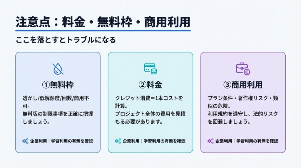 8. 注意点:動画生成AIの料金・無料枠・商用利用