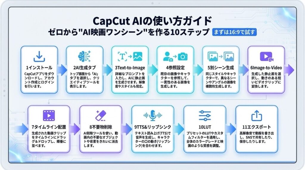 それでは、実際にCapCutを使って「AI映画」のワンシーンを作る手順を解説します。