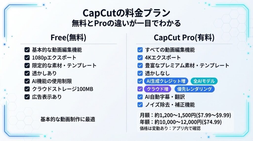 CapCutは基本無料で使えますが、より高度なAI機能や制限解除には「CapCut Pro」への加入が必要です。