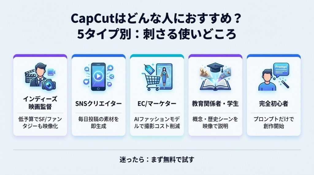 CapCut AIは、その多機能さゆえに、あらゆるクリエイターの武器になります。特におすすめなのは以下の5タイプの方々です。