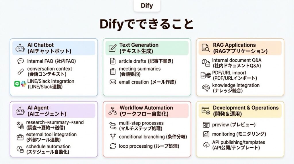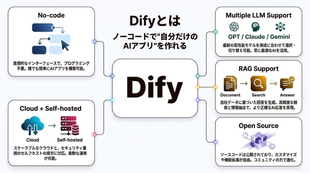 Difyの特徴をざっくりまとめると、こんな感じです。