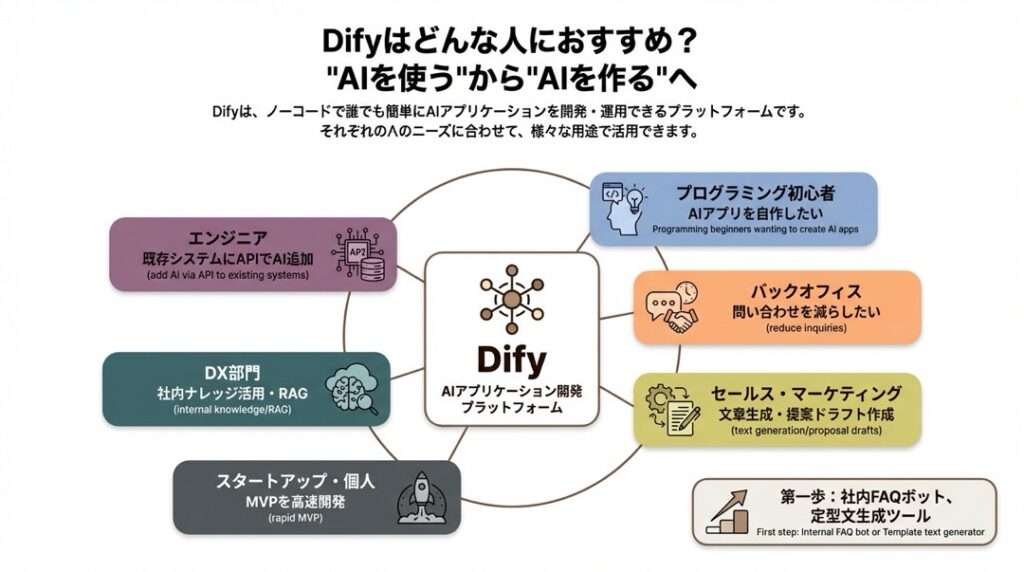 Difyは幅広いユーザーに対応していますが、特に以下のような方におすすめです。