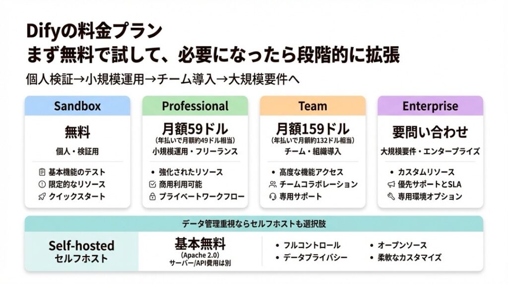 Difyには、利用スタイルに合わせた複数の料金プランが用意されています。