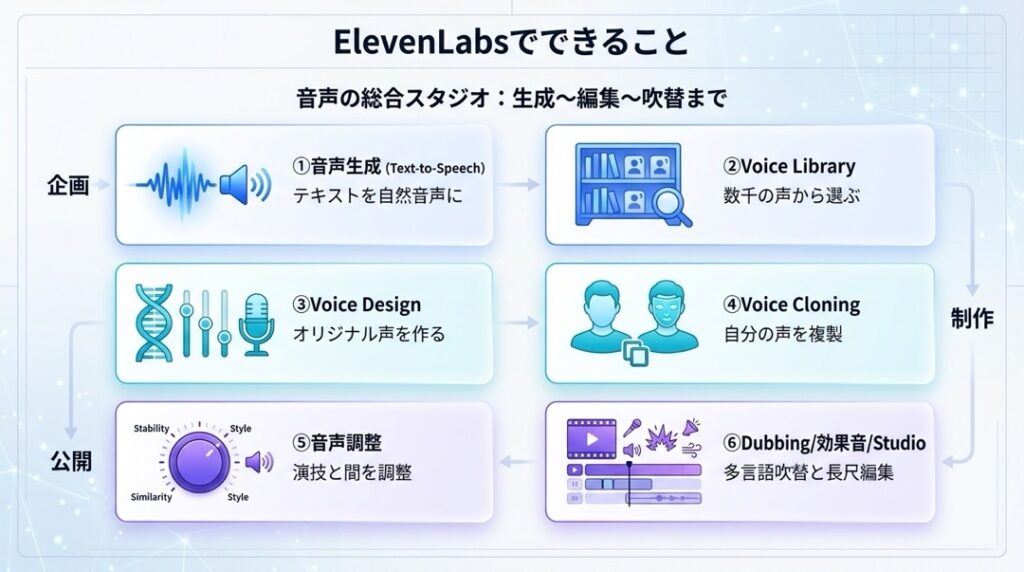 ElevenLabsは、音声に関するあらゆるクリエイティブを可能にする「音声の総合スタジオ」なんです。