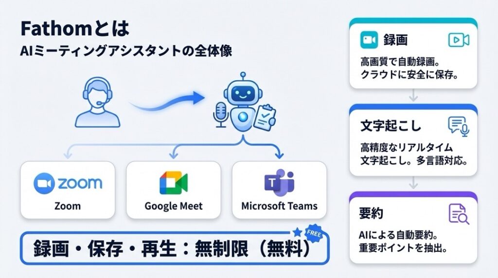 Fathom(ファゾム)は、Zoom、Google Meet、Microsoft Teamsなどのオンライン会議に自動で参加し、録画・文字起こし・要約を行ってくれるAIミーティングアシスタントです。
