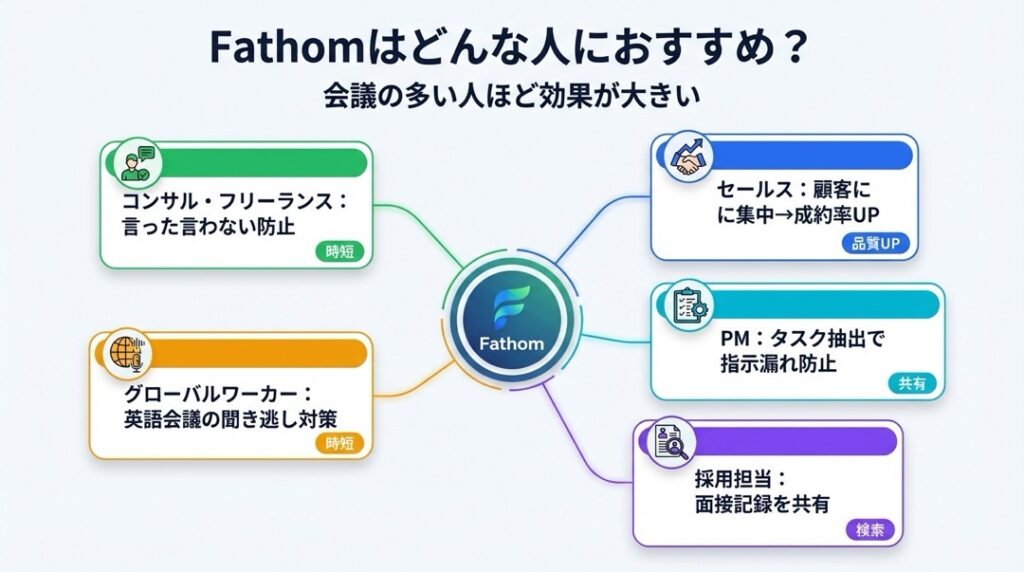 Fathomは「会議がある全ての人」に役立ちますが、特に以下のような人には最強の相棒になります。