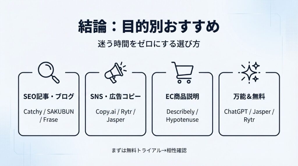 結論:文章作成AIの目的別おすすめ