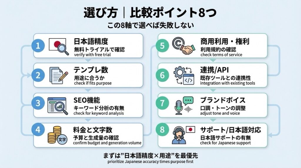 3. 文章作成AIの選び方|比較ポイント8つ