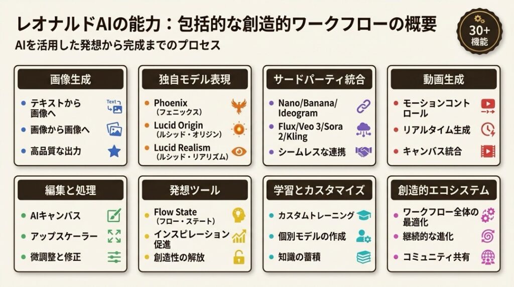 アイデア出しから画像生成、編集、動画化まで、クリエイティブワークフロー全体をカバーしています。