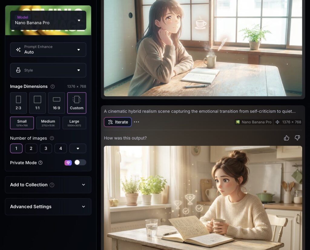 - ✨ Ultra生成モード:約500万画素以上の超高解像度で画像を出力。印刷用途やポスター制作にも対応できるクオリティです。
