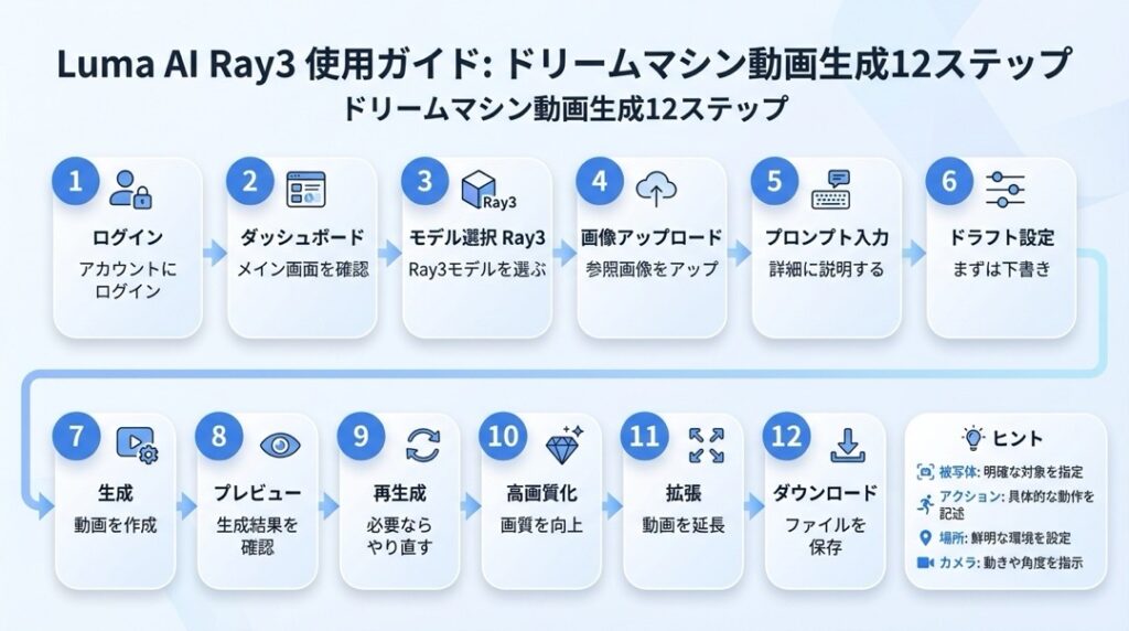 ここでは、最も基本的な「Dream Machine」というプラットフォームを使った方法を、ステップバイステップで解説します。