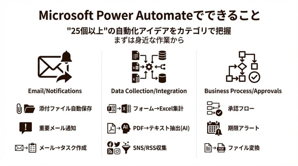 ここでは、Power Automateで実現できることをカテゴリ別に紹介します。