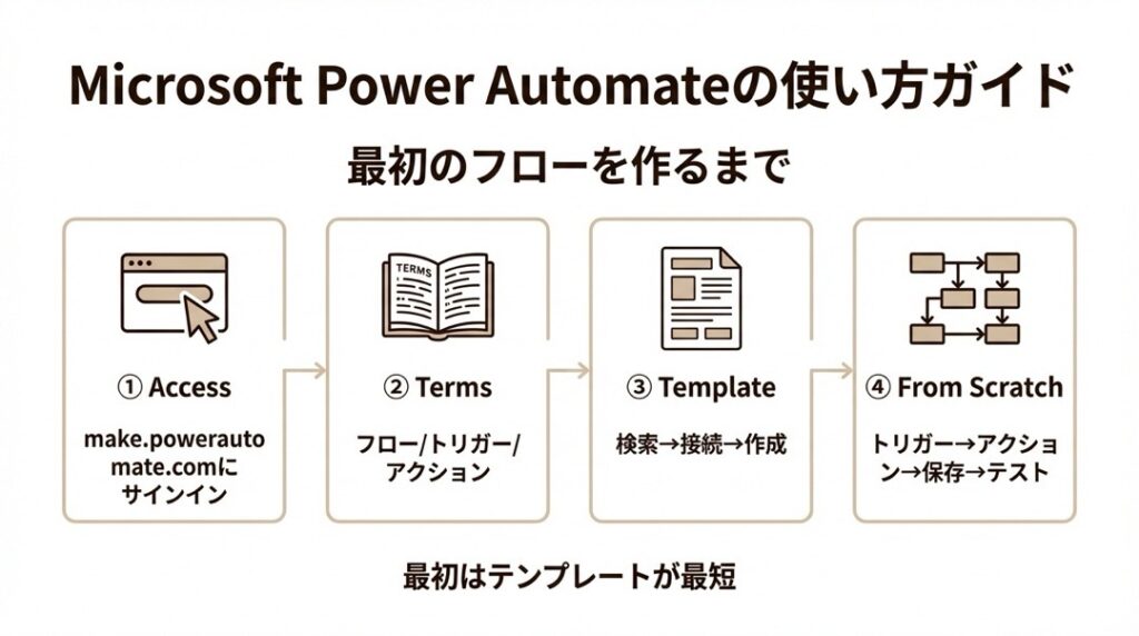 ここでは、Power Automateの基本的な始め方と、最初のフローを作る手順を解説します。