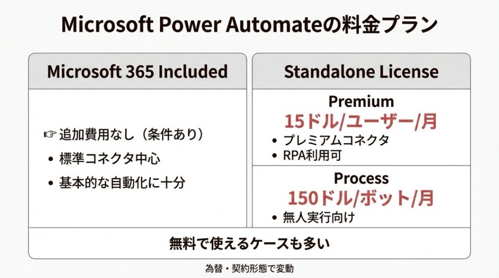 多くの企業で契約している「Microsoft 365(旧Office 365)」のプラン(Business StandardやE3, E5など)には、Power Automateの基本機能が含まれています。
