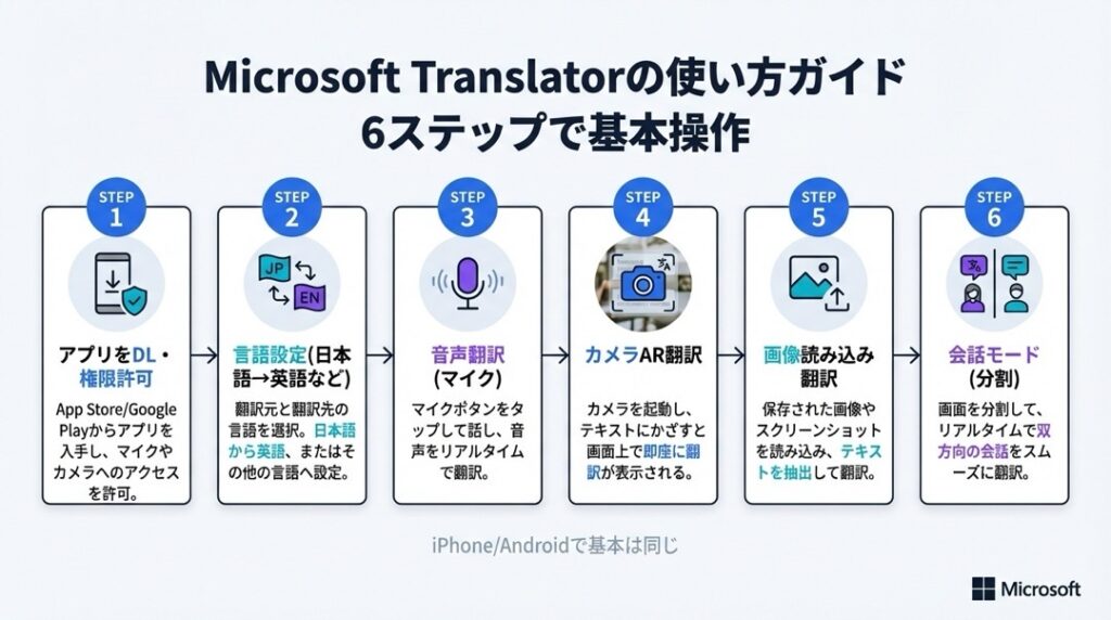 - アプリをダウンロード: App StoreまたはGoogle Playストアで「Microsoft Translator」と検索し、入手(インストール)します。緑色のアイコンが目印です。