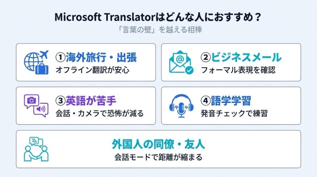 今回は、このMicrosoft Translatorについて、その驚きの機能から具体的な使い方まで、わかりやすく解説していきますね。一緒に「言葉の壁」をひょいっと越えていきましょう!