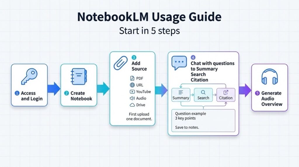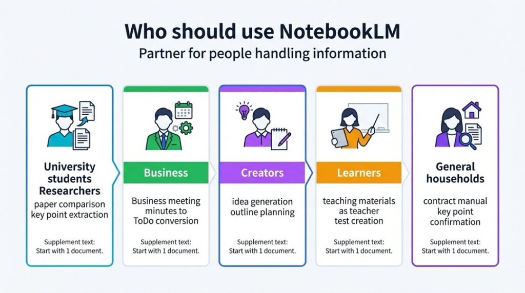 NotebookLMは、情報のインプット、整理、アウトプットまで、あらゆる場面で活躍します。