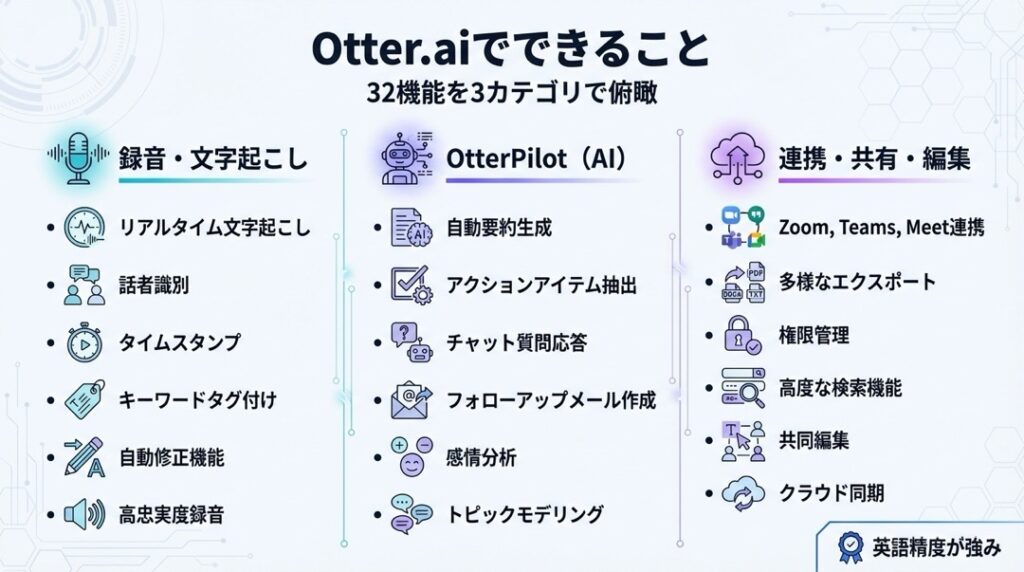 「文字起こしだけでしょ?」と思っているなら、もったいないですよ。Otter.aiには、仕事を効率化するための機能が山のように詰まっています。