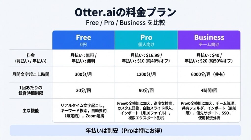 気になりますよね。Otter.aiには無料プランもありますが、ビジネスで本格的に使うなら有料プランが強力です。