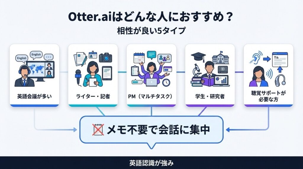基本的には英語に特化したツールです。日本語の認識も不可能ではありませんが、精度はまだ発展途上です。正直なところ、日本語の会議で使うなら他の国産ツールの方が良い場合がありますが、「英語と日本語が混じる会議」や「完全な英語会議」ではOtter.aiが圧倒的なパフォーマンスを発揮します。