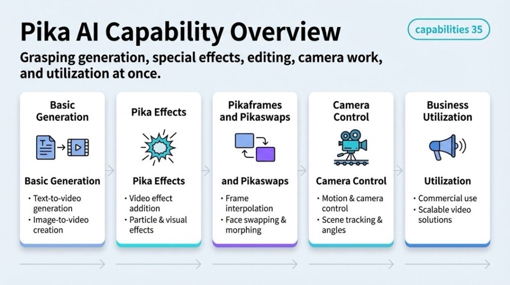 ここでは、基本的な生成から、Pika独自のユニークな機能(Pikaframesなど)まで、35個の「できること」を具体的にリストアップしました。