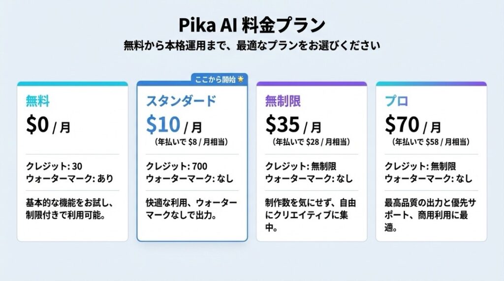 Pika AIは無料で使い始めることができますが、本格的に使いたい人のために有料プランも用意されています。
