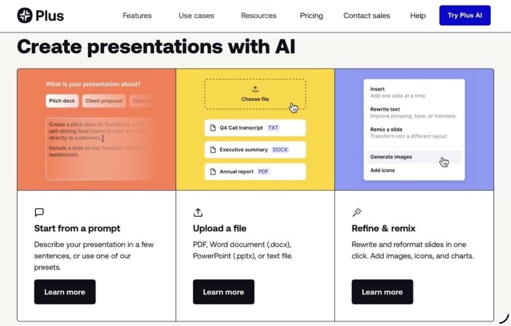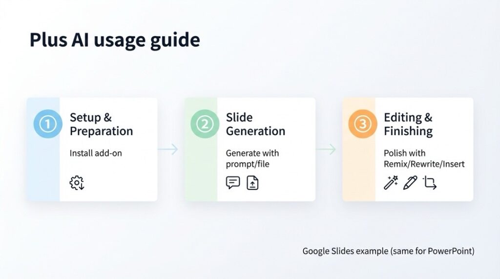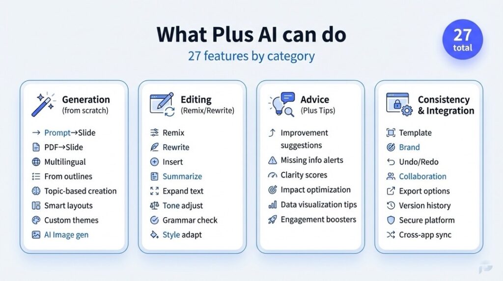 Plus AI(プラスエーアイ)は、GoogleスライドおよびMicrosoft PowerPointの中で直接動作する、AI搭載のプレゼンテーション作成ツールです。
