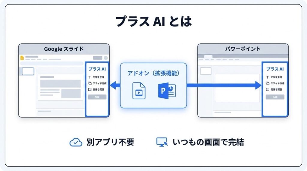 普段使っているGoogleスライドやPowerPointの中で、AIが「専属のアシスタント」として一緒に資料を作ってくれるツールがあるんです。それが「Plus AI」。
