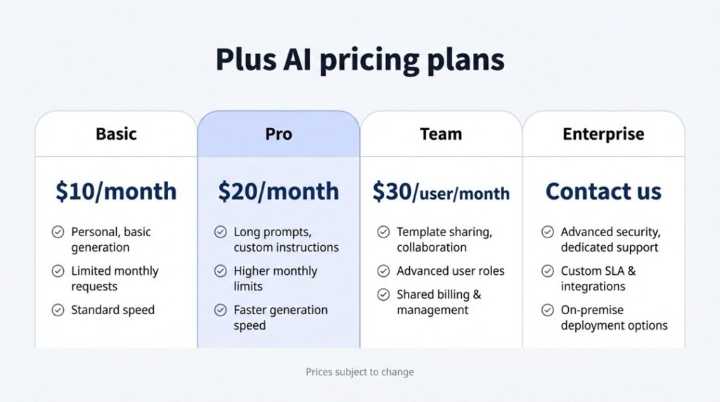 Plus AIは、エンタープライズ企業向けの高いセキュリティ基準を持っています。ただし、機密情報を扱う場合は、会社の規定に従い、Enterpriseプランの利用を検討するか、個人情報の入力には注意してください。
