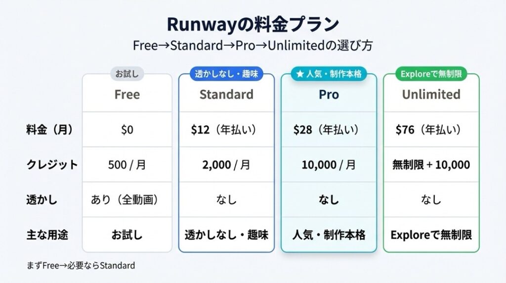 まずはFreeで操作感を試し、「透かしを消したい」「もっと作りたい」と思ったらStandardへ。本気で作品作りをするならPro以上がコスパ良しです。