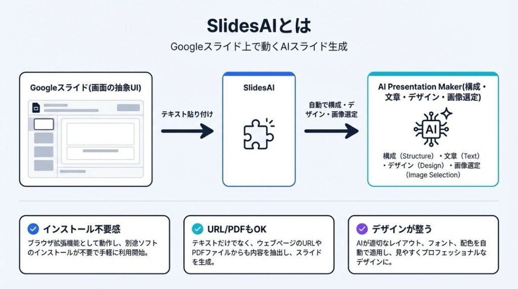 SlidesAIは、Googleスライド上で直接動作する、AIプレゼンテーション作成ツール(Google Workspace拡張機能)です。