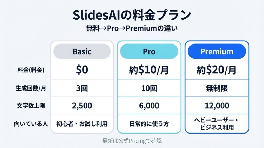 SlidesAIには、無料お試し枠と、本格的に使うための有料プランがあります。