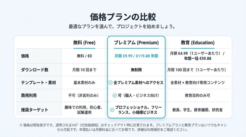 - 素材:FreepikやFlaticonのプレミアム素材へのアクセス