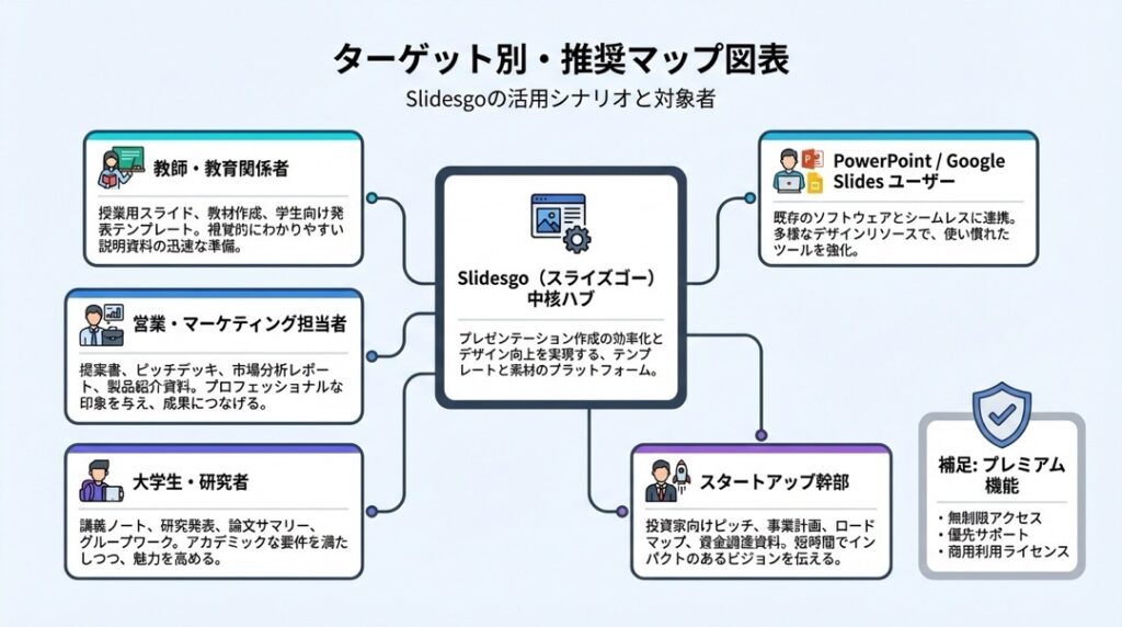 Slidesgoは、デザインのプロではないけれど、プロ並みのアウトプットが必要なすべての人におすすめです。特に以下のタイプの方には相性抜群です。