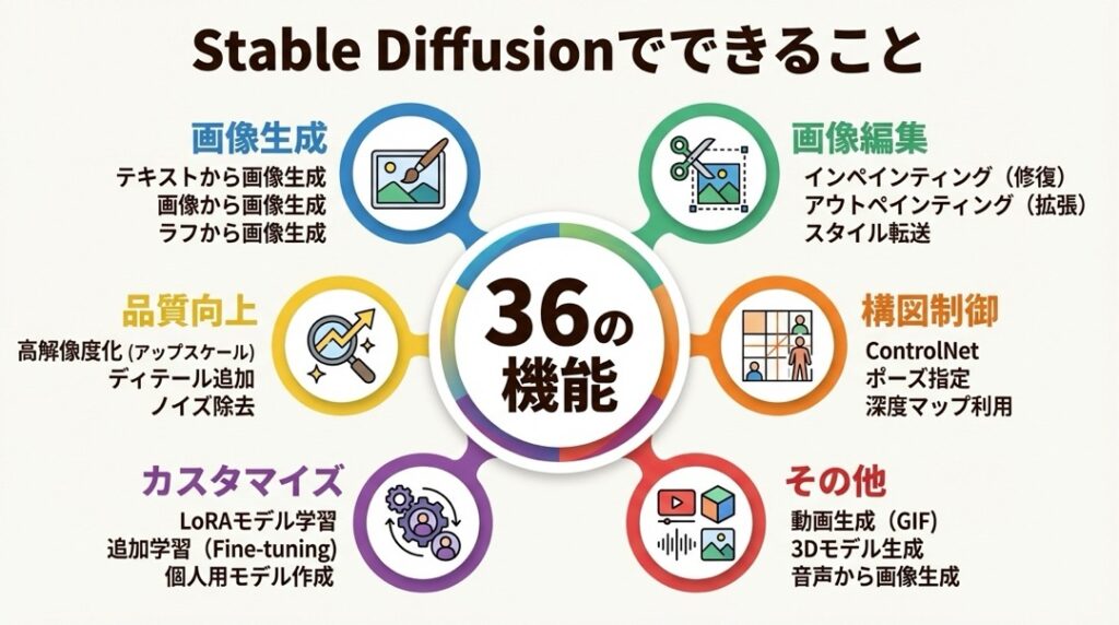 ここでは、Stable Diffusionでできることを機能別に紹介していきますね。