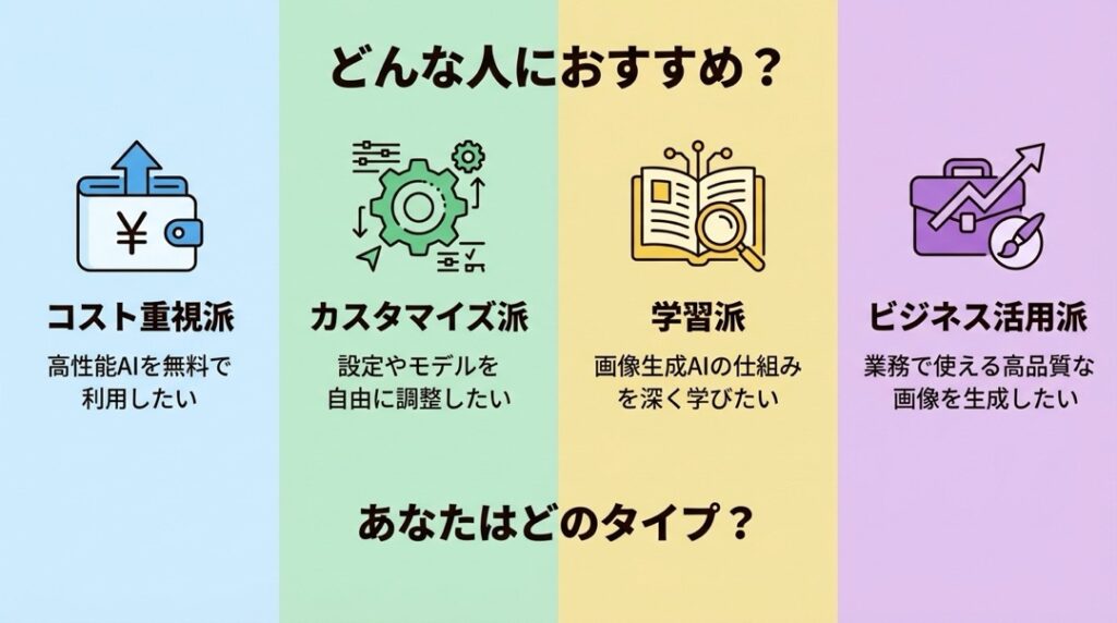 Stable Diffusionが向いている人:無料で使いたい、細かくカスタマイズしたい、ローカルで動かしたい、技術的な学びを得たい
