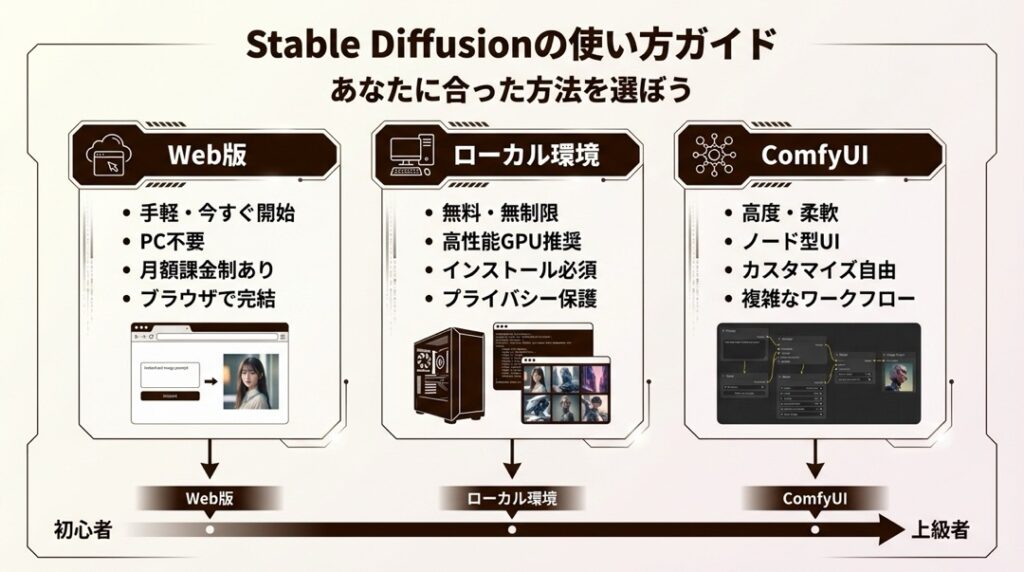 Stable Diffusionの使い方は、大きく分けて3つあります。