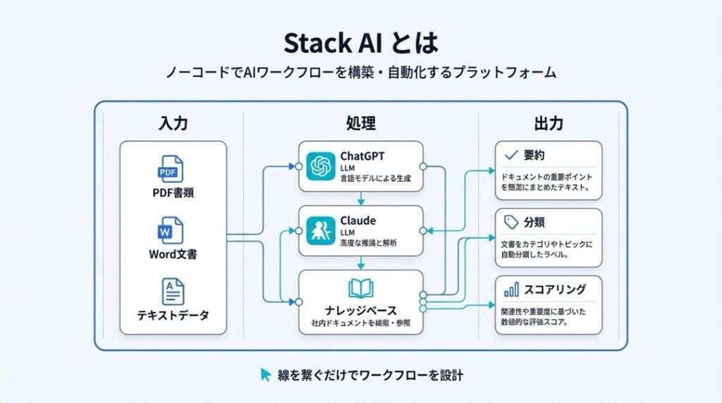 Stack AIは、プログラミングの知識がなくても、直感的な操作で高度なAIアプリケーションを構築できる「ノーコードプラットフォーム」です。