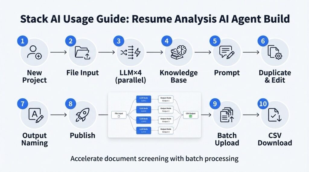 ここでは、実際にStack AIを使って「採用候補者の履歴書を自動で分析し、強み・弱み・スコアを出すAIエージェント」を作る手順を解説します。