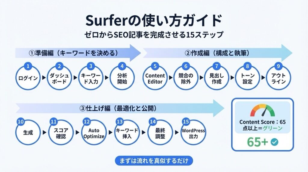 ここでは「Surfer AIを使って、ゼロからSEO記事を完成させる手順」をステップバイステップで解説します。
