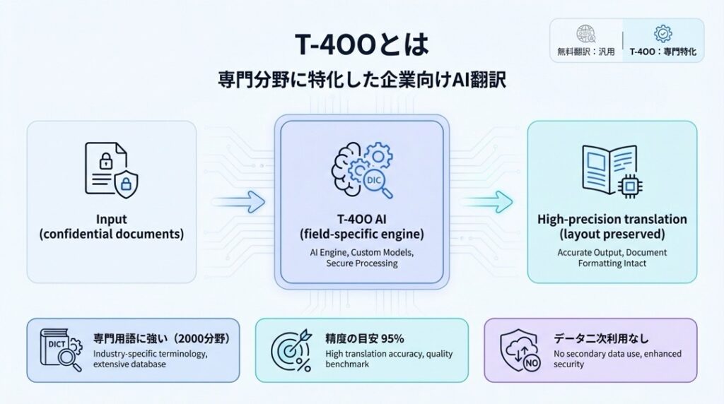 T-4OO(ティーフォーダブルオー)は、企業向けの超高精度AI自動翻訳サービスです。