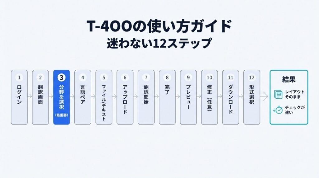 ここがT-4OOのキモです。翻訳したい文書がどのジャンル(法務、医薬、機械など)なのか、2,000の分野から最適なものを選びます。これを選ぶだけで精度が劇的に変わります。