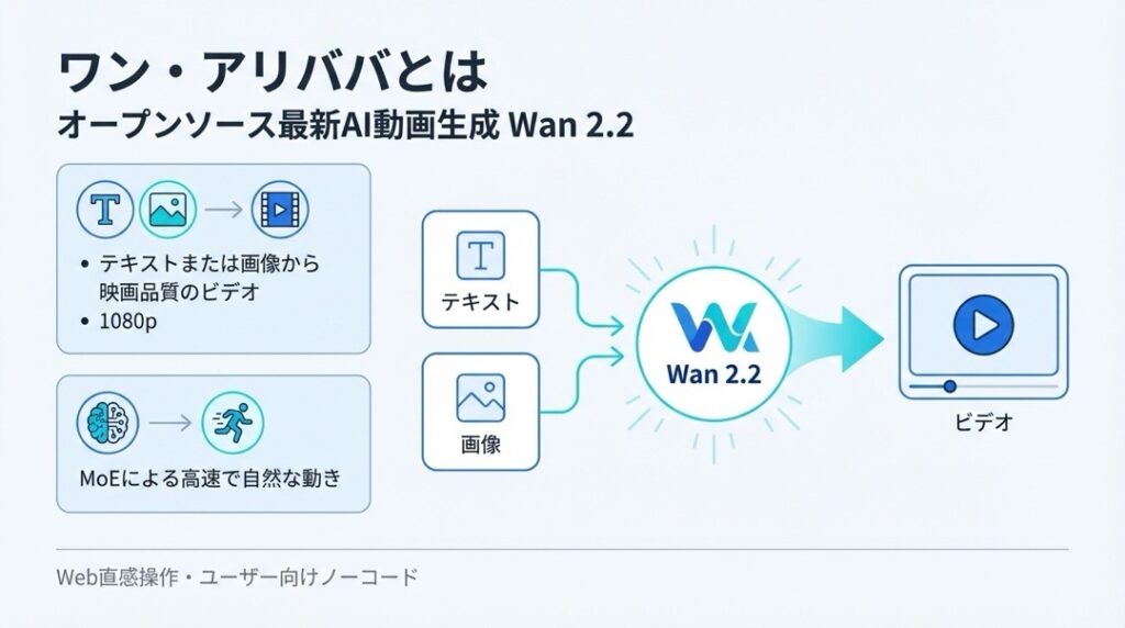 Wan 2.2は、以前のバージョン(2.1)から大きく進化し、最大1080pの高画質、より自然な動き、そして「Mixture of Experts(MoE)」という高度な技術によって、高速かつ効率的な動画生成を実現しています。