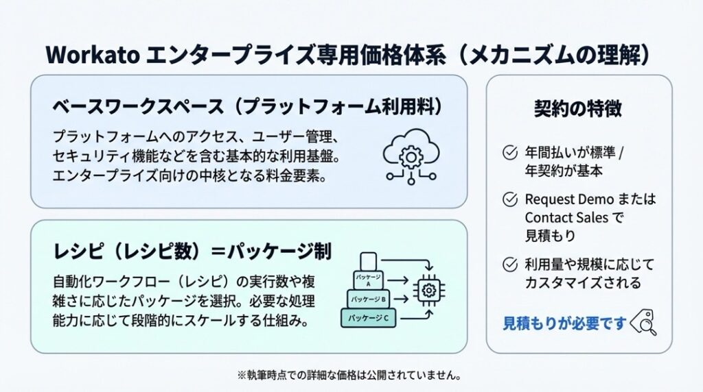 Workatoの料金体系は、一般的なSaaSとは少し異なり、企業の規模や利用量に合わせたカスタマイズが前提となっています。