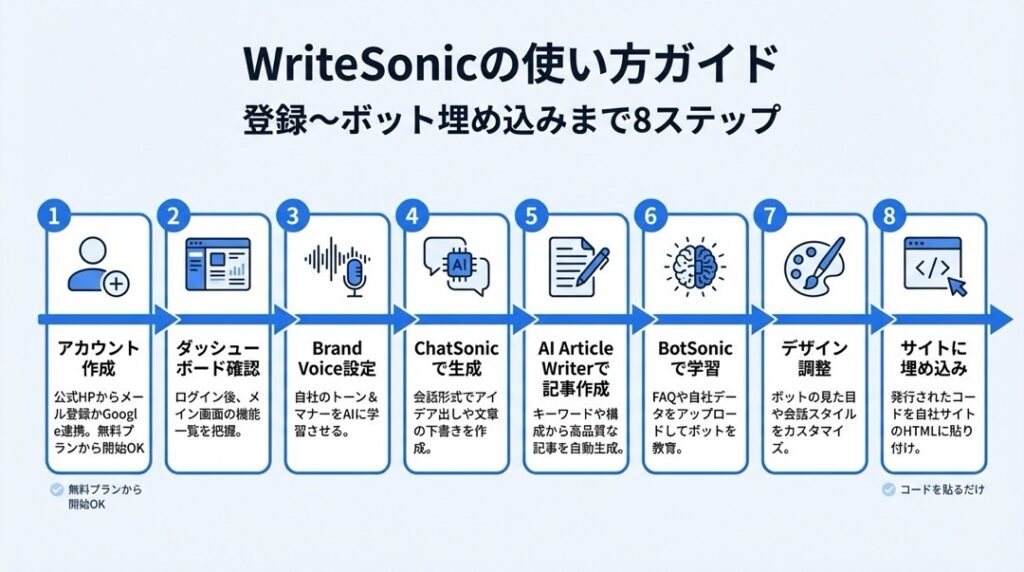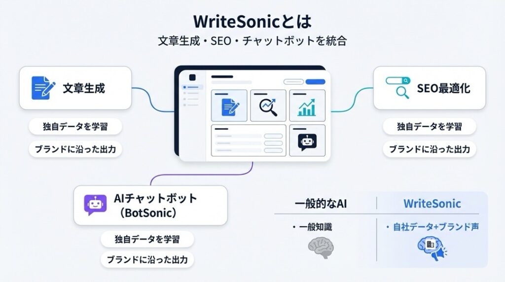 WriteSonicは、文章生成、SEO対策、そしてAIチャットボット構築までをワンストップで行える、AI搭載の統合プラットフォームです。